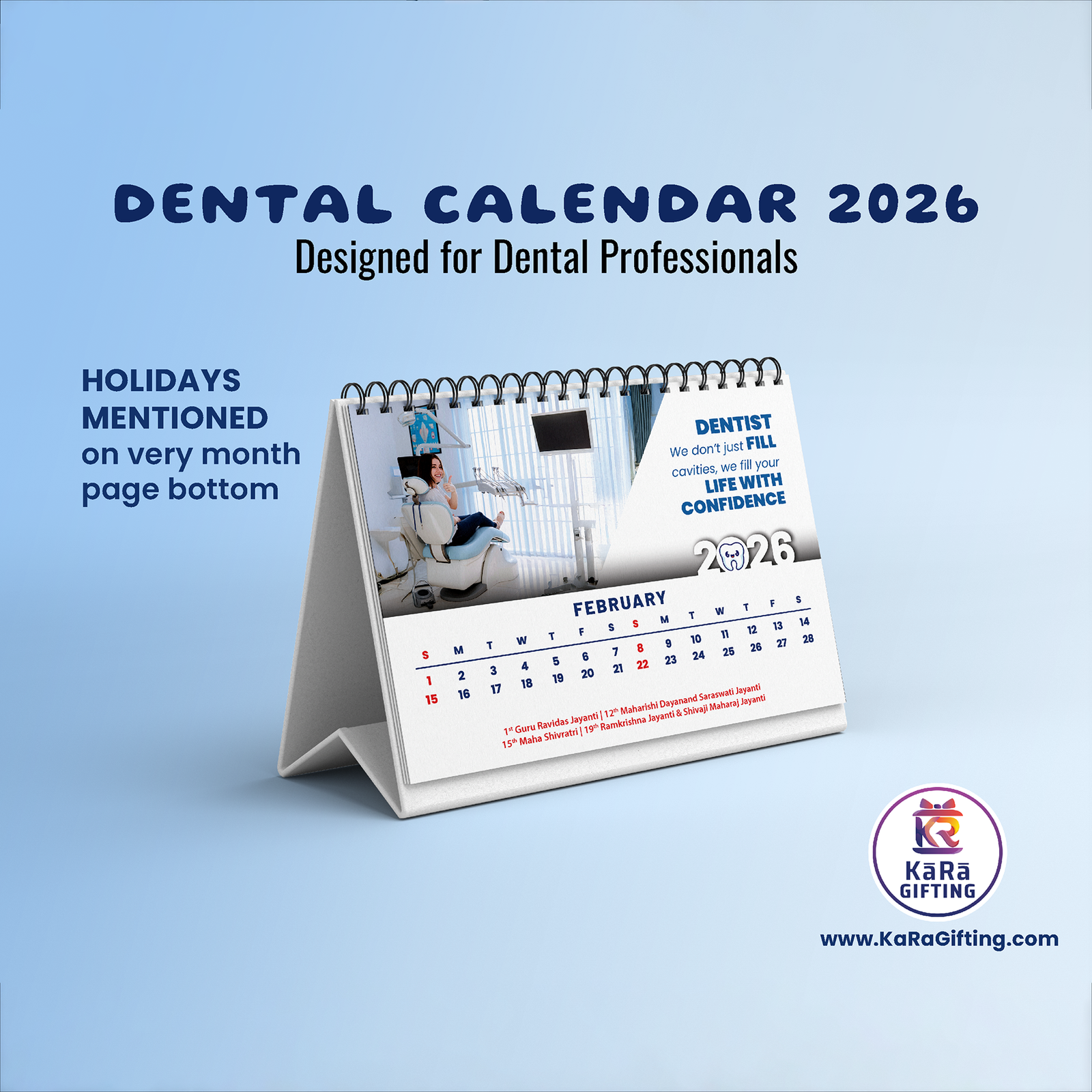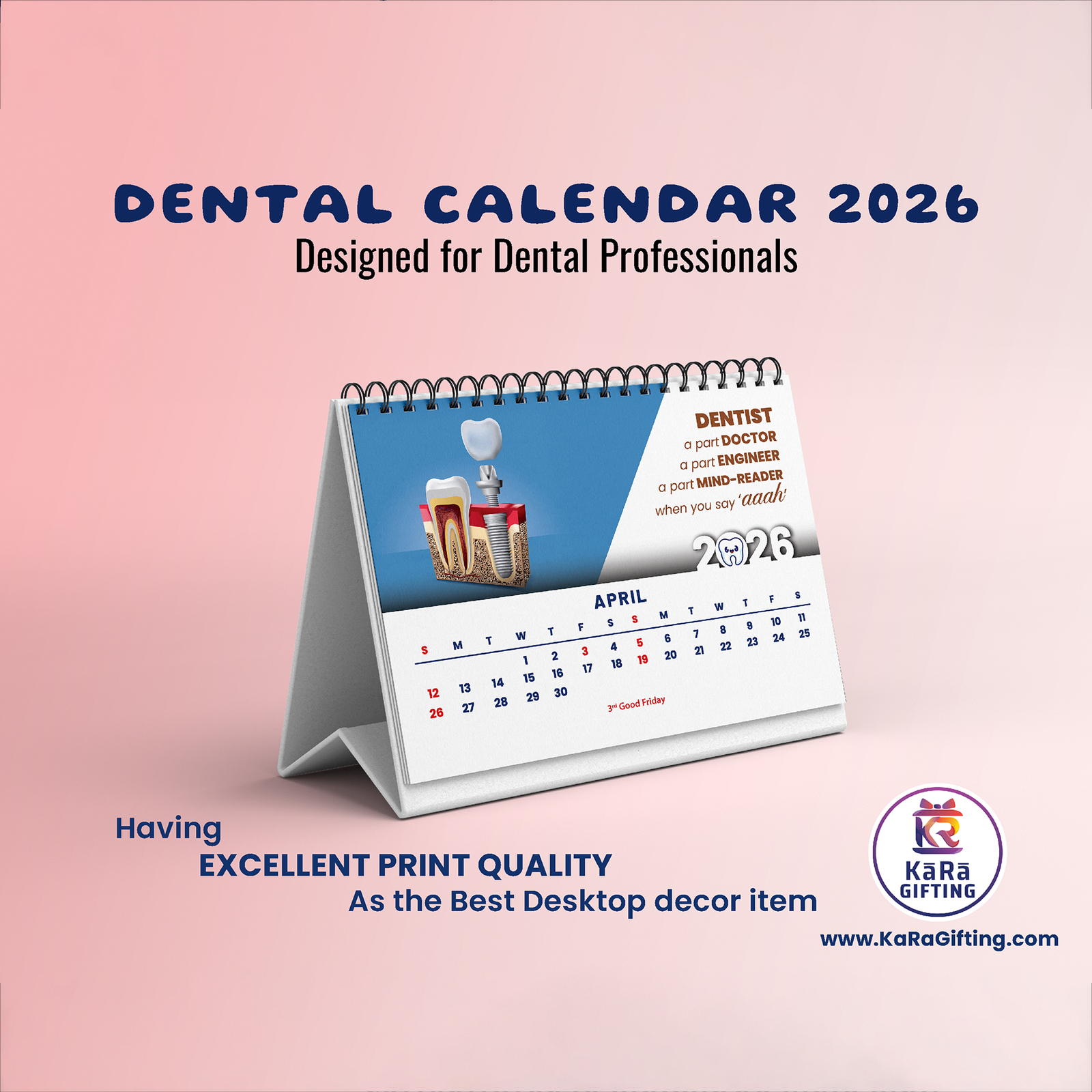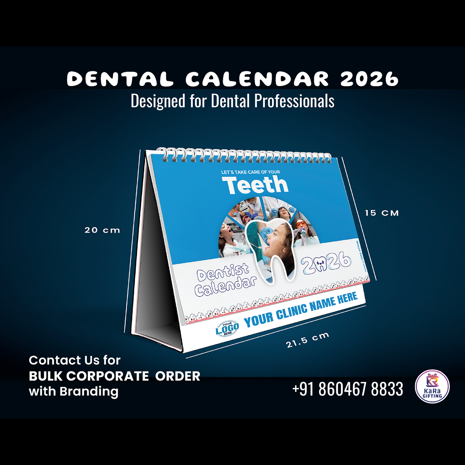 The calendar is customizable for branding with your company name/logo. The calendar pack is completed with a custom note card that has your company name and a personal message note of wishes shared by you. This calendar pack is perfect as a New Year corporate gift for all dental field practitioners.